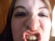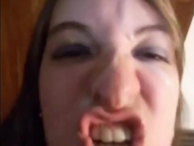 After cumming all over her face, she starts licking her lips clean.