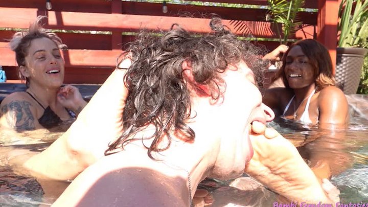 Paris love and andi move things to the hot tub outside where they continue to dominate their bitch boy, bambi. paris relaxes as bambi licks and sucks on her big, wide size 11 feet and soles! meanwhile andi tells paris about the benefits of chastity and keeping their bitch boy's cock locked while he serves them. she hands paris the key to bambi's chastity device, granting paris complete control over his pleasure and orgasms. not that he will cum anytime soon. andi makes bambi gag hard on paris's huge, meaty feet. sometimes he gets a gush of hot tub water in his mouth too. he also massages and rubs their feet to further soothe his mistress and goddess. this is "top tier" treatment to paris. she even drops his chastity key in the water - by mistake? who knows! oh, well. andi and paris continue to make out in front of bambi as he worships both of their feet! paris talks about how she can't wait for bambi to worship her in the presence of her new lover, which will come in part three!