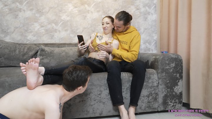 Avril's lover, sam, asked her out on a date. but avril has a better idea. she invited sam to stay home and mock her pathetic husband. “today you will be for us what we say, you pathetic nonentity!” sam said and began to wash his and avril’s shoes on her husband’s tongue. lucas doesn't like sam's teasing, but he continues to obediently follow all their orders. avril decided to test her husband as a pony and now he will often carry his wife and her lover on his back. after some good entertainment, avril and sam decided to reward lucas and feed him a delicious dinner. “any creature would be happy with this food, show your pleasure” - avril said and ordered lucas to eat the pet food. sometimes avril and sam would spit in the slave's mouth to help him wash down the dry food. and for dessert she left the most delicious thing - cigarettes. they fed the idiot ashes and cigarette ends. it seems like this kind of entertainment is much more fun than a regular date.