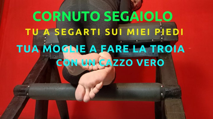 Povero cornuto quale sei, tu, rimasto a casa, da solo, mentre quella troia di tua moglie e' uscita per andarsi a scopare un vero cazzo, non come il tuo inutile coso che hai tra le gambe. ti ritrovi di nuovo qui, davanti ad un mio video, davanti ai miei piedi, per farti insultare intanto che ti fai una sega, immaginando come tua moglie si stia davvero divertendo. che inutile sfigato che sei poor cuckold that you are, you, left at home, alone, while your slut of a wife went out to go fuck a real cock, not like your useless thing between your legs. you find yourself here again, in front of a video of me, in front of my feet, to be insulted while you jerk off, imagining how your wife is really enjoying herself. what a useless loser you are